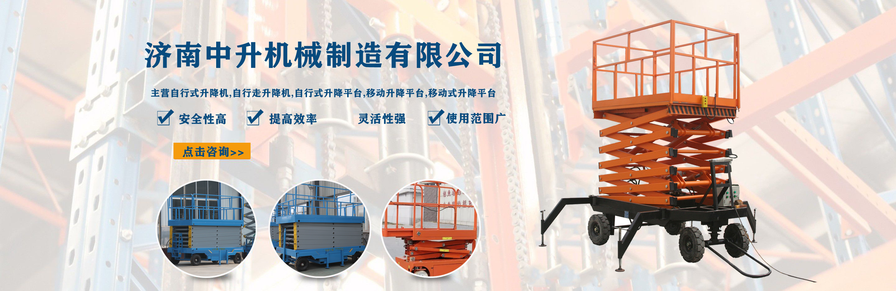 濟南中升機械制造有限公司主營自行式升降機,自行走升降機,自行式升降平臺,移動升降平臺,移動式升降平臺等產品,產品廣泛用于廠房維護、工業安裝、設備檢修、物業管理、倉庫、航空、機場、港口、車站、加油站、體育場、展覽館等多種行業和場所,  公司設備精良、工藝合理、檢測手段齊全,技術力量充足,公司創立伊始即本著“專注、專心”的經營理念,依托技術團隊優勢和設備硬件保障,全力打造良心的升降平臺企業。  我公司始終以“品質為本,服務至上”作為企業宗旨。只要你訂購了我公司的產品,無論你身處何方,我們都會及時派出技術人員為你服務!...